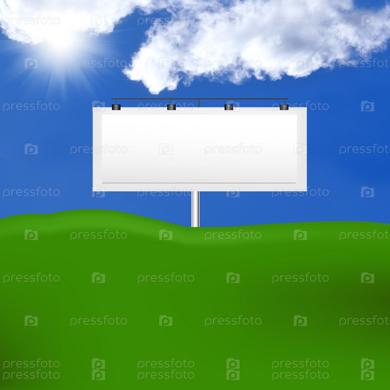 Рекламный билборд на фоне зеленого поля и голубого облачного неба
