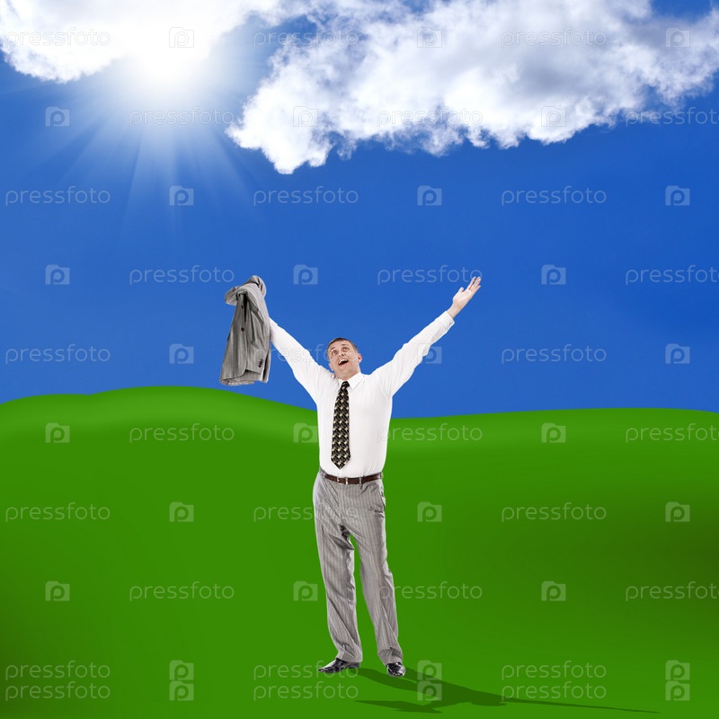 Счастливый бизнесмен на фоне зеленого луга и голубого солнечного неба