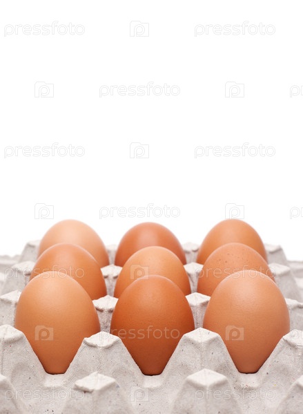 Девять яиц в лотке на белом фоне
