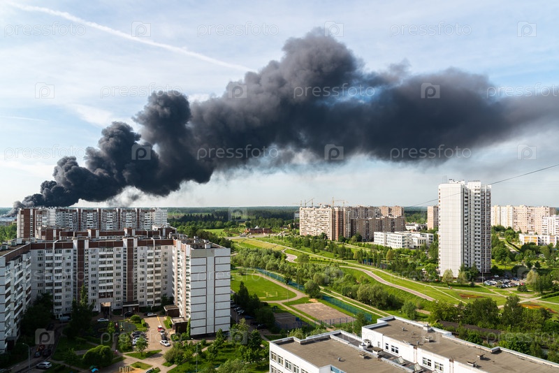 Черный дым от крупного пожара в Москве, Россия