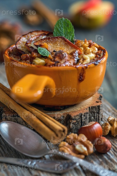 Запеченные овсяные хлопья с яблоками, корицей и орехами