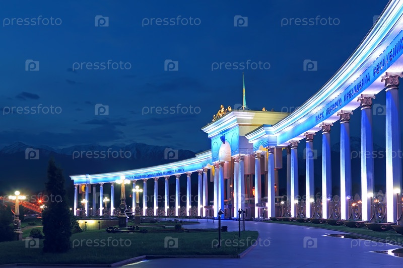 Ночная подсветка колоннады парка президента в Алма-Ате
