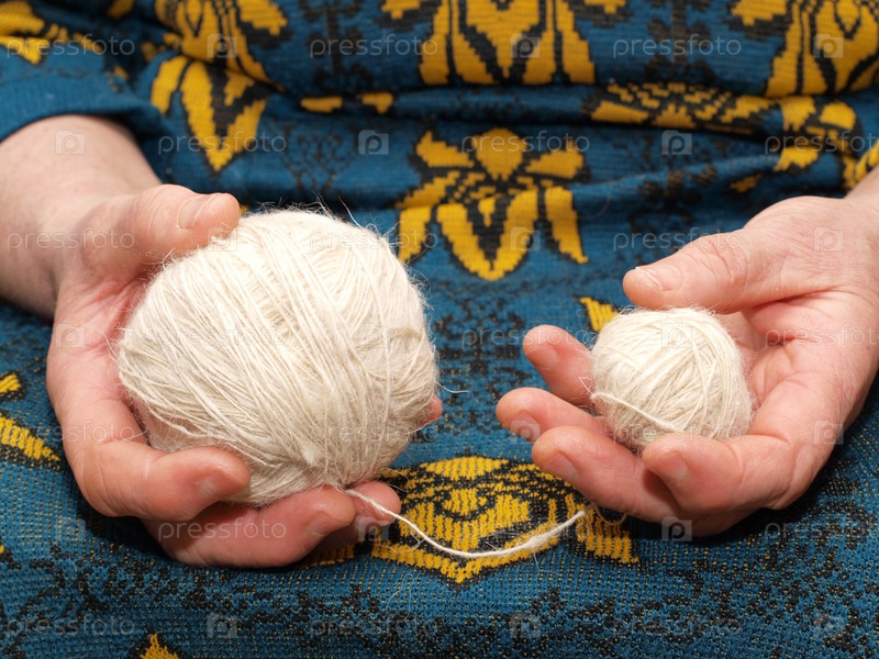 Два клубка белых шерстяных ниток в руках пожилой женщины