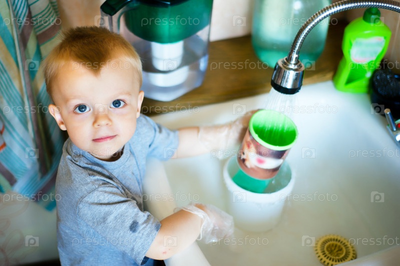 Маленький мальчик моет посуду