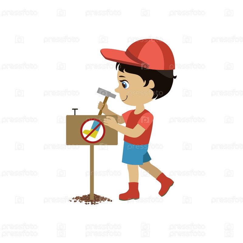 Мальчик приколачивает знак