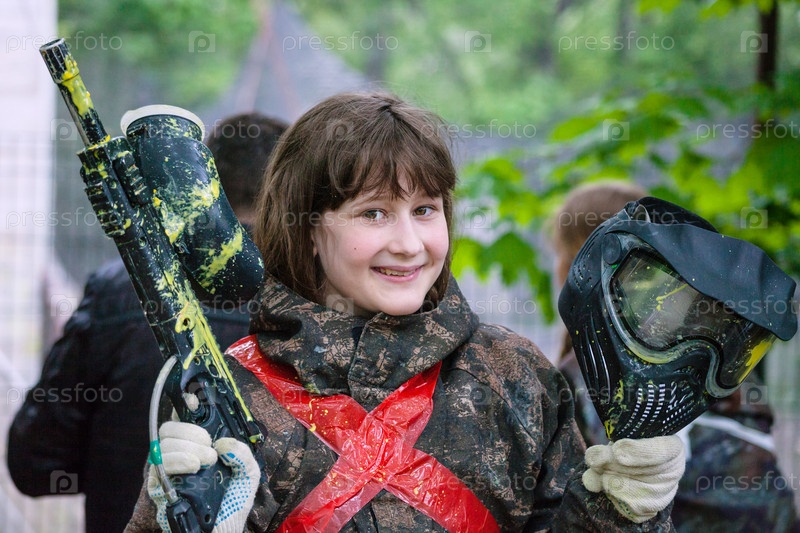 Девушка в камуфляже перед игрой в пейнтбол