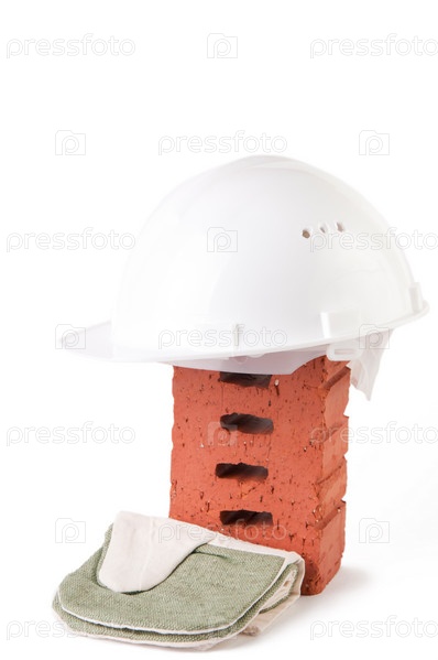 Концепция строительства с кирпичом, каской и рукавицами, белый фон