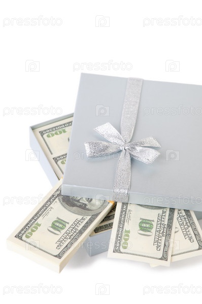 Крупным планом подарочная коробка с долларами, белый фон