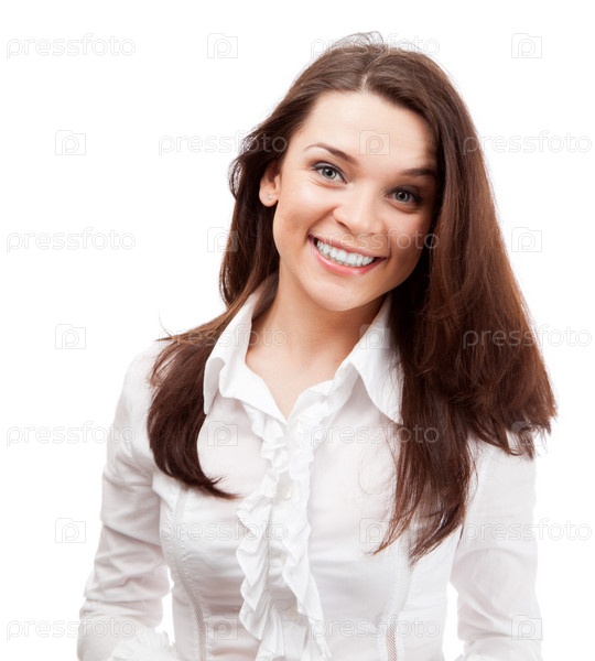 Счастливая молодая брюнетка на белом фоне