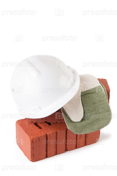 Строительная каска, кирпич и рукавицы, изолированы на белом фоне