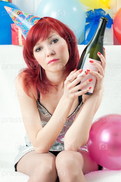 Грустная рыжеволосая девушка с бутылкой и сигаретой на вечеринке