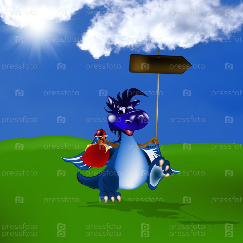 Счастливый синий дракон с мешком подарков на летнем зеленом лугу