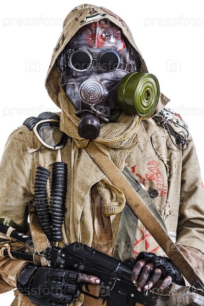 Человек в защитном костюме с оружием