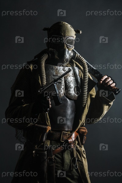 Человек в защитном костюме с оружием