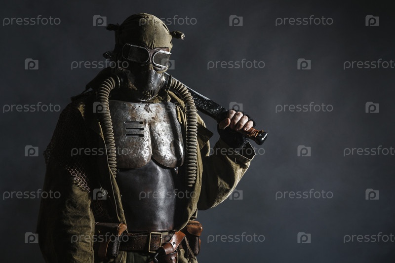 Человек в защитном костюме с оружием