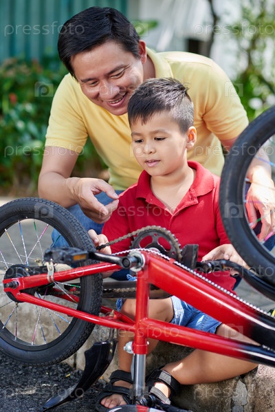 Отец и сын чинят велосипед