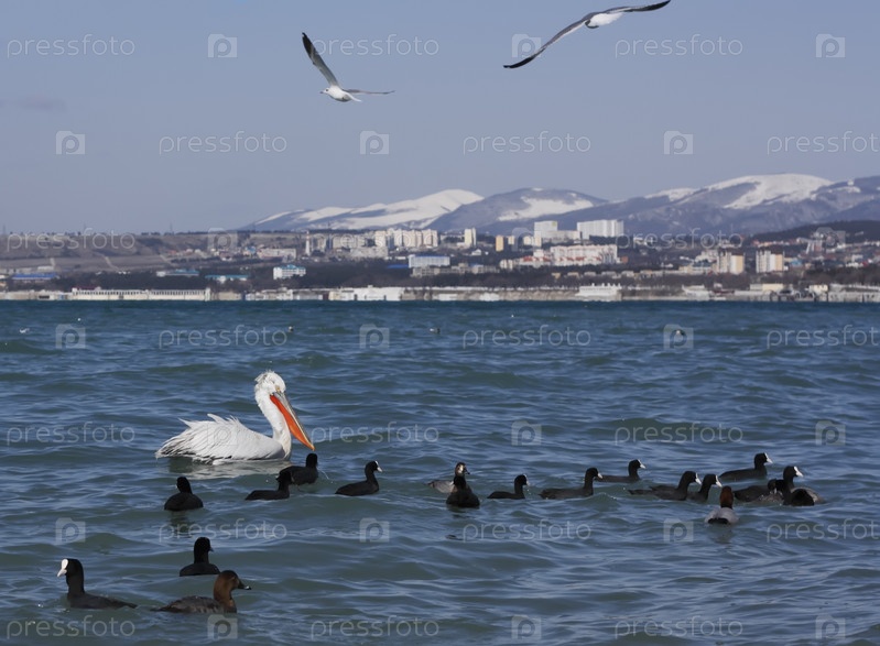 Пеликан с утками на море