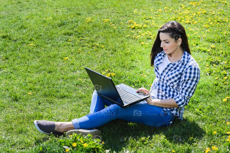 Девушка с ноутбуком на лужайке