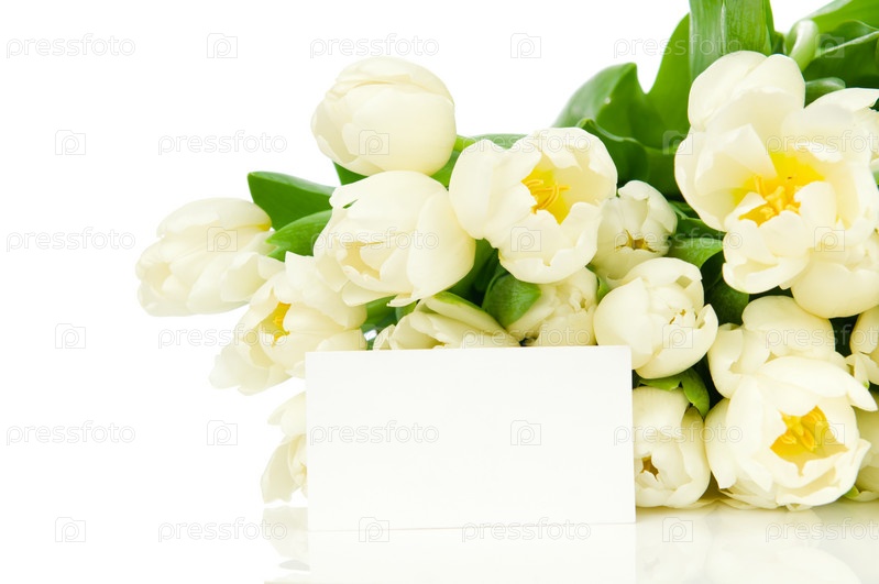 Букет тюльпанов и карточка, изолировано на белом фоне