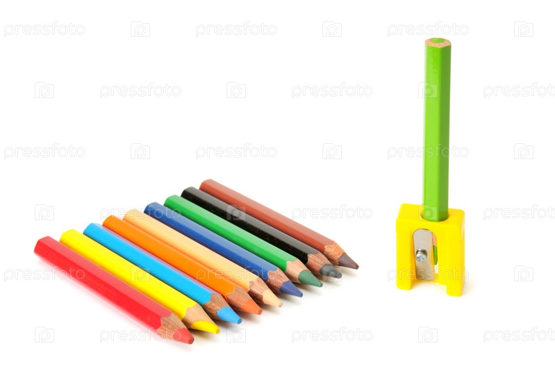 Цветные карандаши и точилка на белом фоне