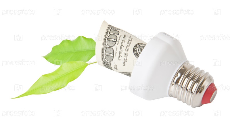 Энергосберегающая лампа и деньги, изолировано на белом фоне