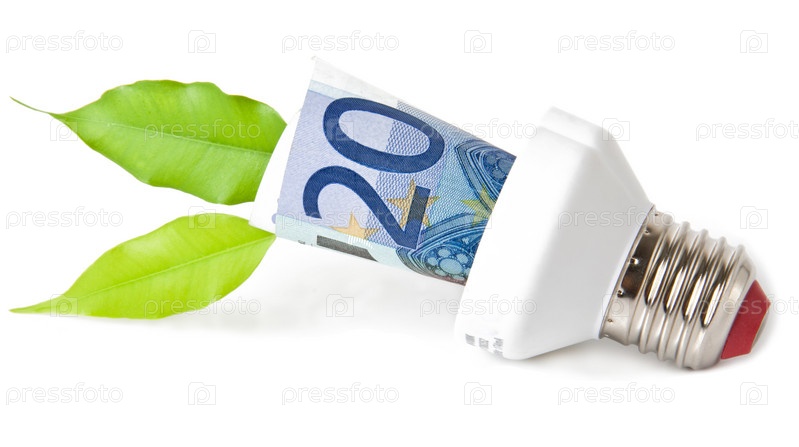 Энергосберегающая лампа и деньги, изолировано на белом фоне