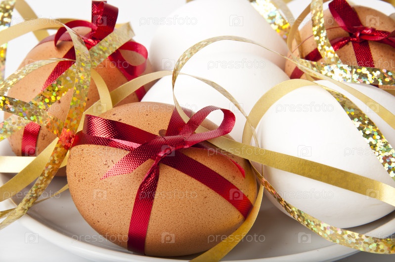 Пасхальные яйца в белой тарелке на белом фоне