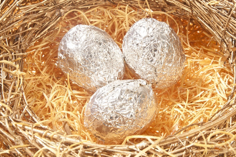 Три яйца в серебряной фольге лежат в гнезде на соломе
