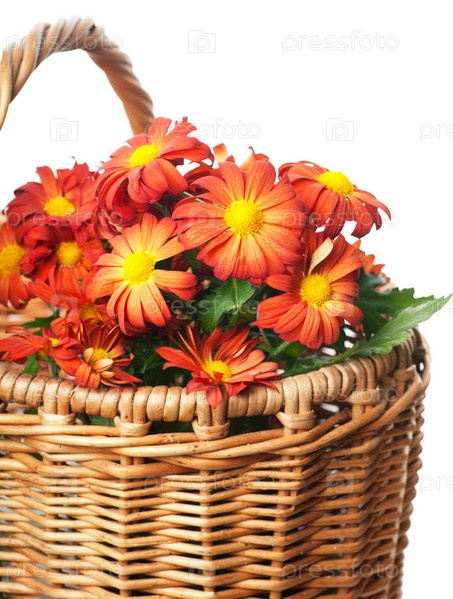 Букет из красных хризантем в корзине на белом фоне