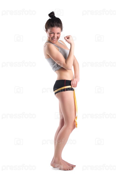 Женщина измеряет объем бедер, изолированная на белом фоне