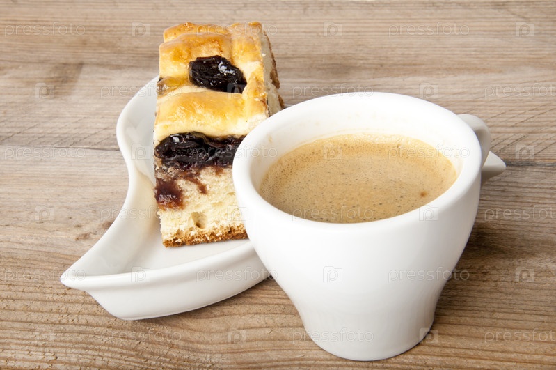 Чашка кофе и кусок пирога с вишневым джемом на столе