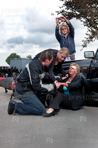 Случайные прохожие фотографируют и оказывают первую медицинскую помощь водителю, пострадавшему в автомобильной аварии