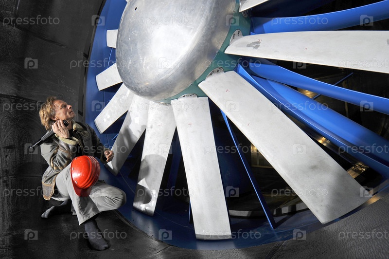Инженер в надлежащей защитной одежде изучает ротор промышленного аэродинамического оборудования