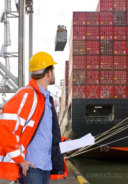 Сотрудник порта наблюдает за погрузкой огромного контейнеровоза