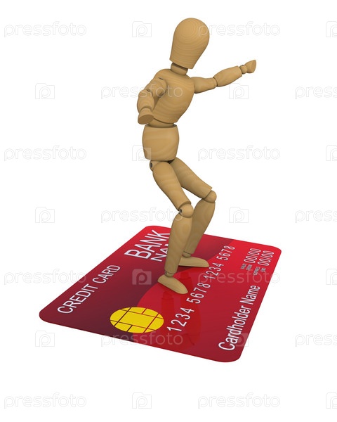 Деревянный человек стоит на кредитной карте в позе серфингиста
