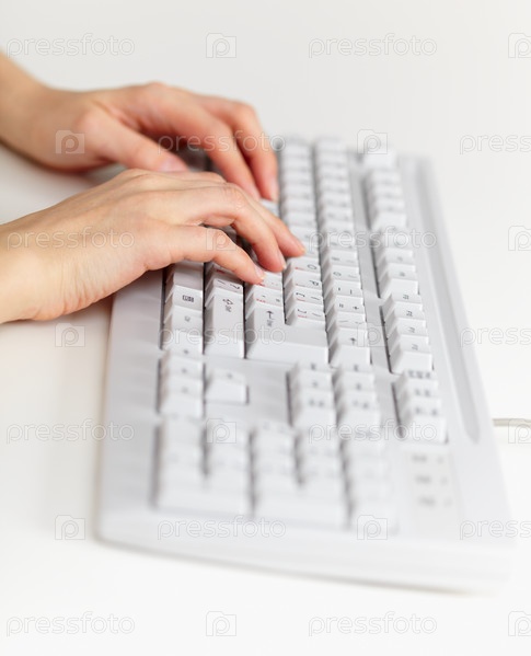 Серая компьютерная клавиатура с женскими пальцами на светлом фоне