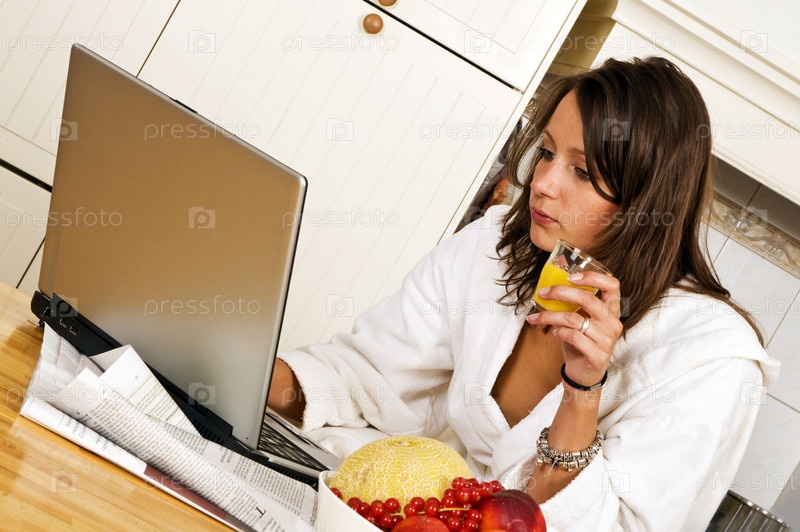 Молодая женщина с соком за ноутбуком