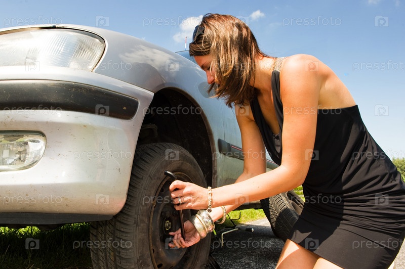 Молодая женщина чинит машину