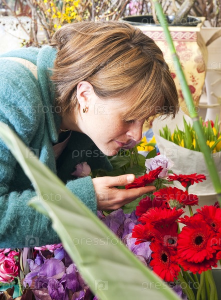 Женщина нюхает цветы в магазине