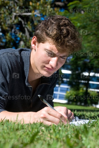 Студент работает на свежем воздухе