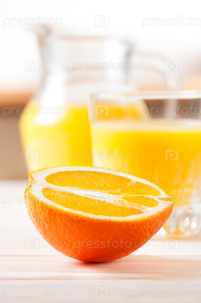 Разрезанный апельсин и апельсиновый сок в стакане