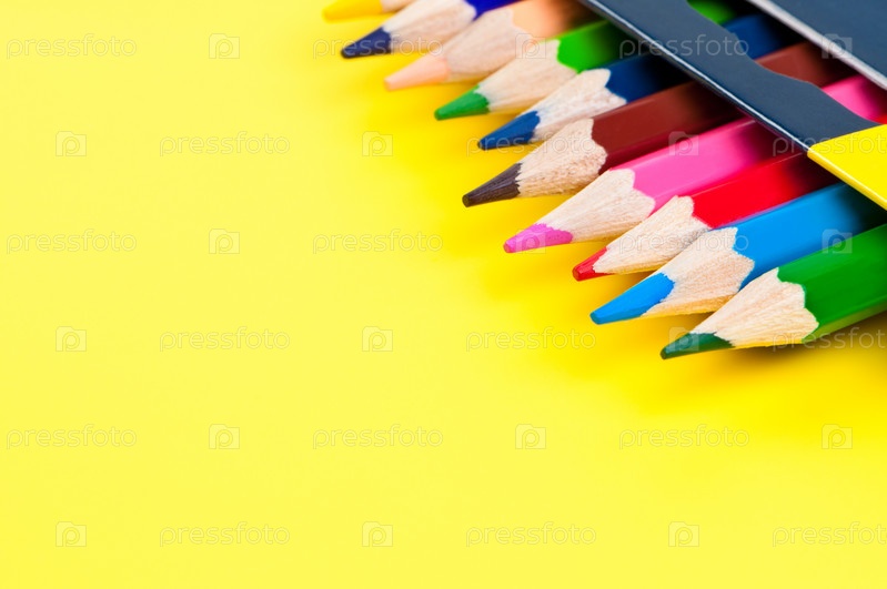 Цветные карандаши в коробке на желтом фоне