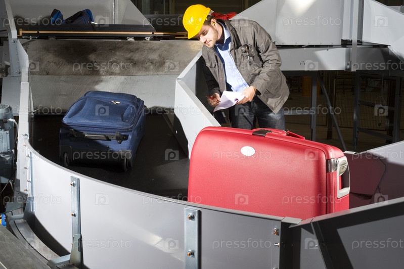 Работник аэропорта проверяет багаж на транспортере