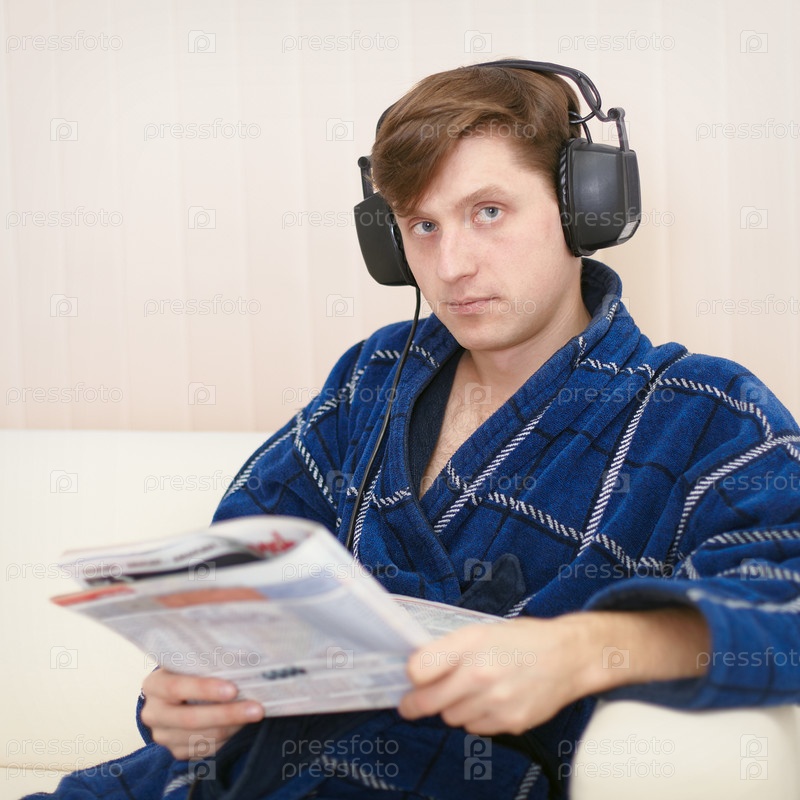 Человек с большими наушниками на голове читает журнал, сидя на диване в домашнем халате