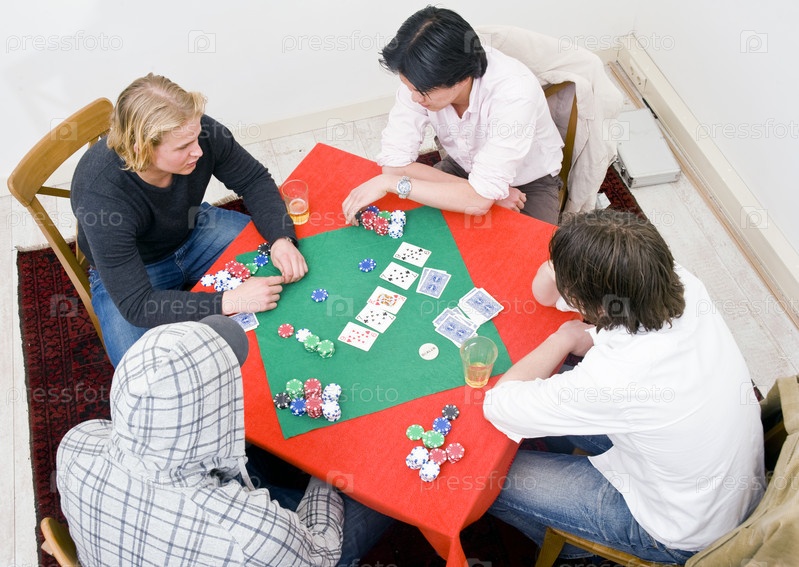 Четыре человека сидят вокруг стола для покера и играют в карты