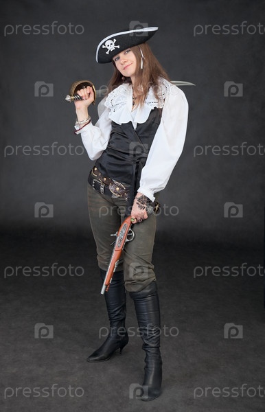 Девушка в пиратском костюме с старинными мечами и пистолетом в руках