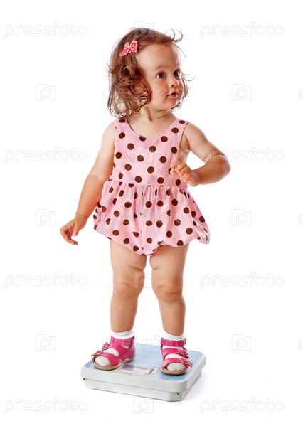 Маленькая девочка на весах на белом фоне