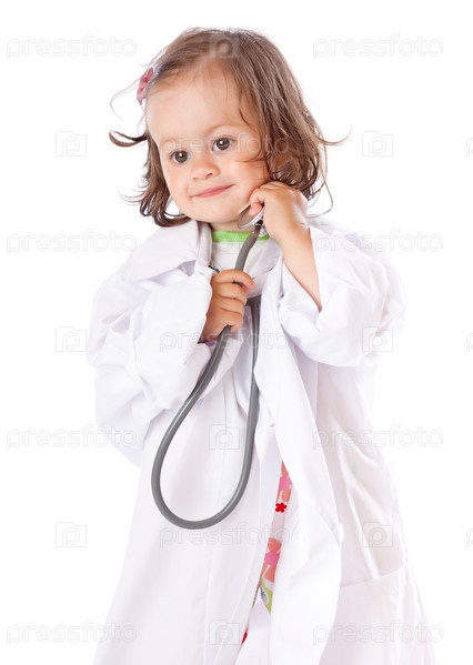 Маленькая девочка играет в доктора на белом фоне