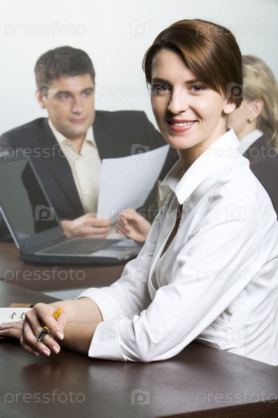 Портрет улыбающейся деловой женщины, смотрящей на камеру с жёлтым ручкой в руках и двух бизнесменов, работающих над ноутбуком, сидящих за столом на заднем плане
