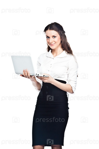 Портрет молодой, красивой и успешной деловой женщины с белым ноутбуком в руках